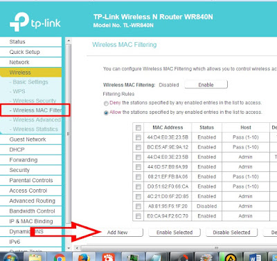 2. Setalah login dan memasukkan username dan password Tp-Link kalian masing-masing, barikutnya kalian pilih menu Wireless > Wireless MAC Filtering > Add New