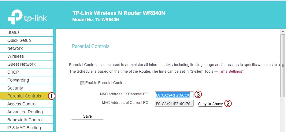 Setelah login pilih menu Parental Controls > Copy to Above dan itulah MAC Address perangkat kalian